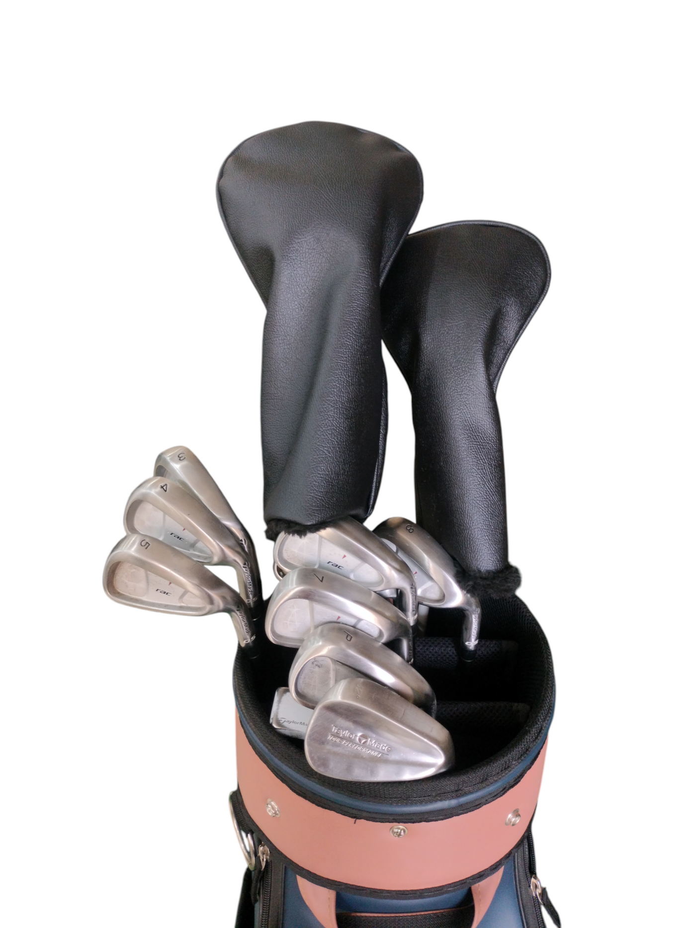 This is a TaylorMade Assorted Graphite Full Golf Set, consisting of 12 clubs, a cart bag, and wood covers.